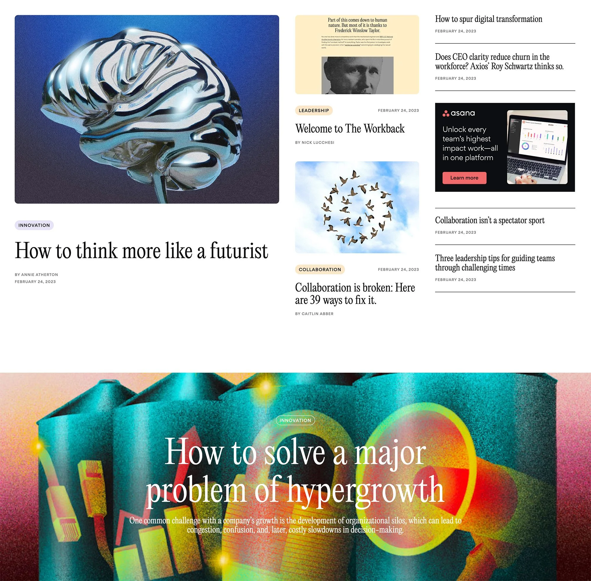 The Workback is Asana’s brand agnostic digital publication about the future of work. As such, it was intentionally imagined as a distinctive sub-brand from the Asana parent brand, sharing the essence of the same core brand and visual DNA while maintaining its own editorial and unique look & feel.